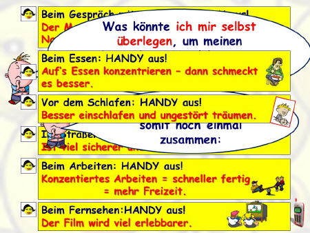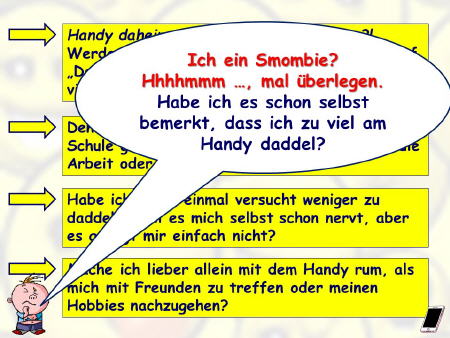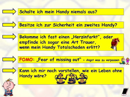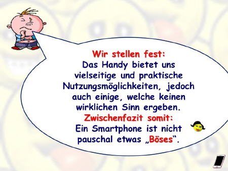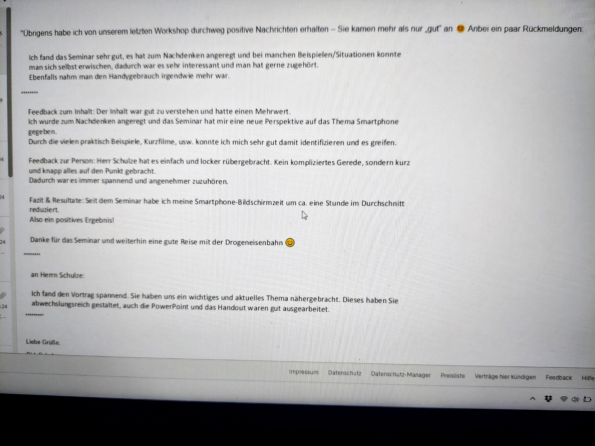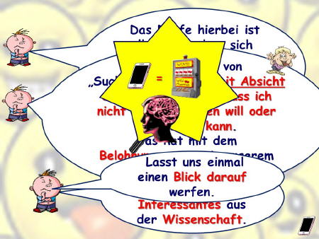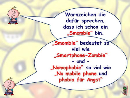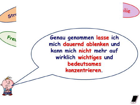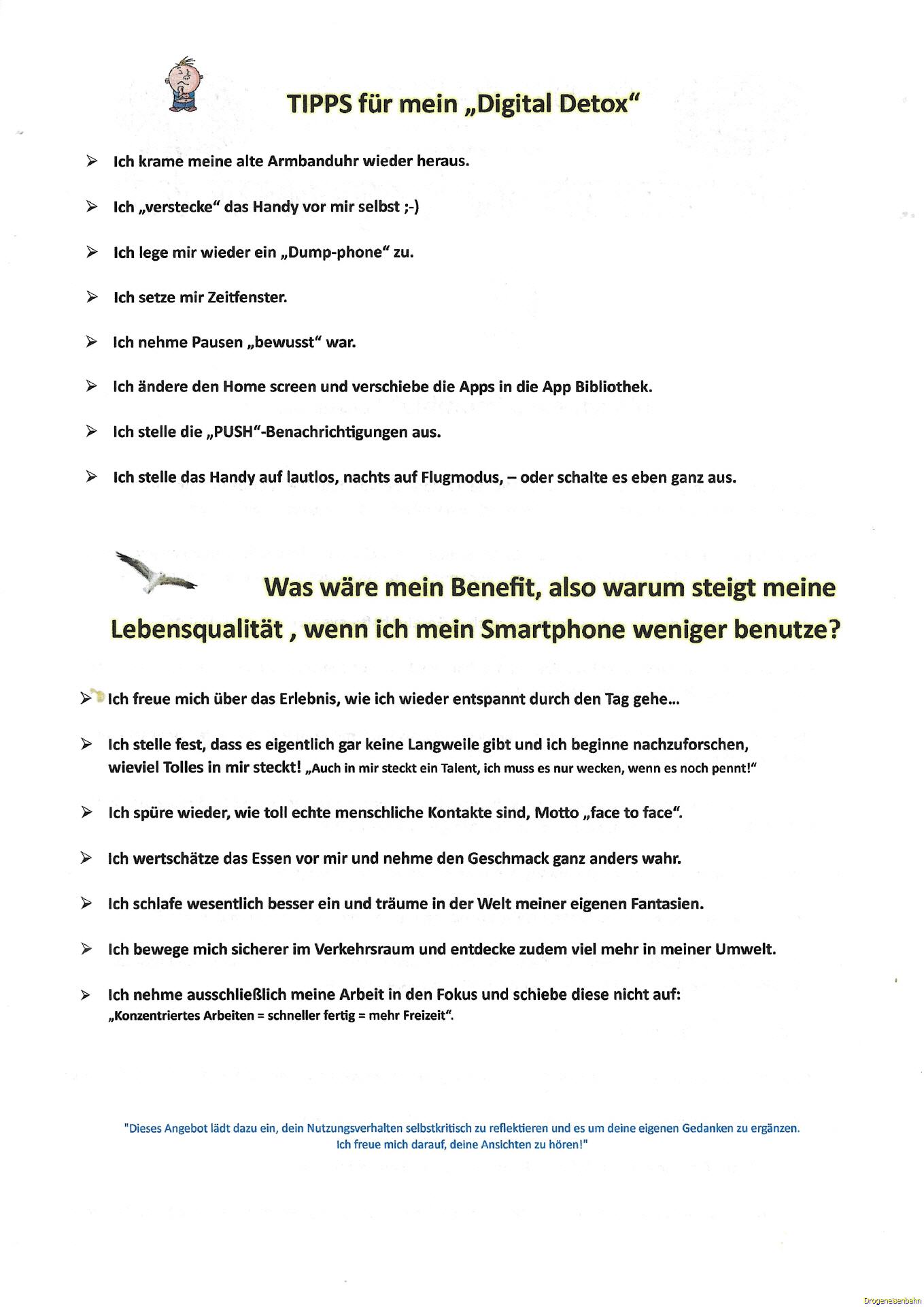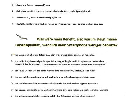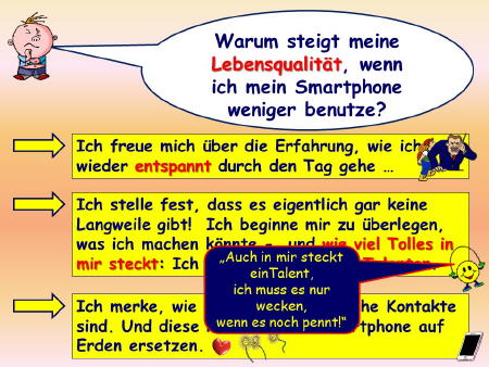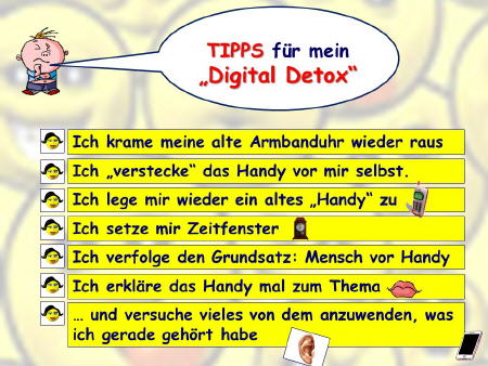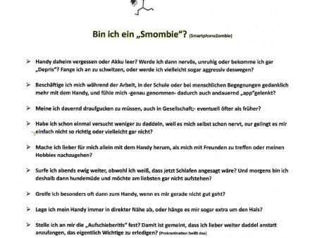 2.) Dieses Modul lässt sich in erweiteter Fassung als 2stündige Veranstaltung anlässlich von Präventionsmaßnahmen aller Art einsetzen (Jugendliche ab 16, junge Erwachsene/Gesundheitstage/Themenmeeting in Firmen, Vereinen, o.a.) Beispiel: "I love my smartphone" im Therapiezentrum Münzesheim im Rahmen einer Patienteninformation (sh. nachstehender Link)