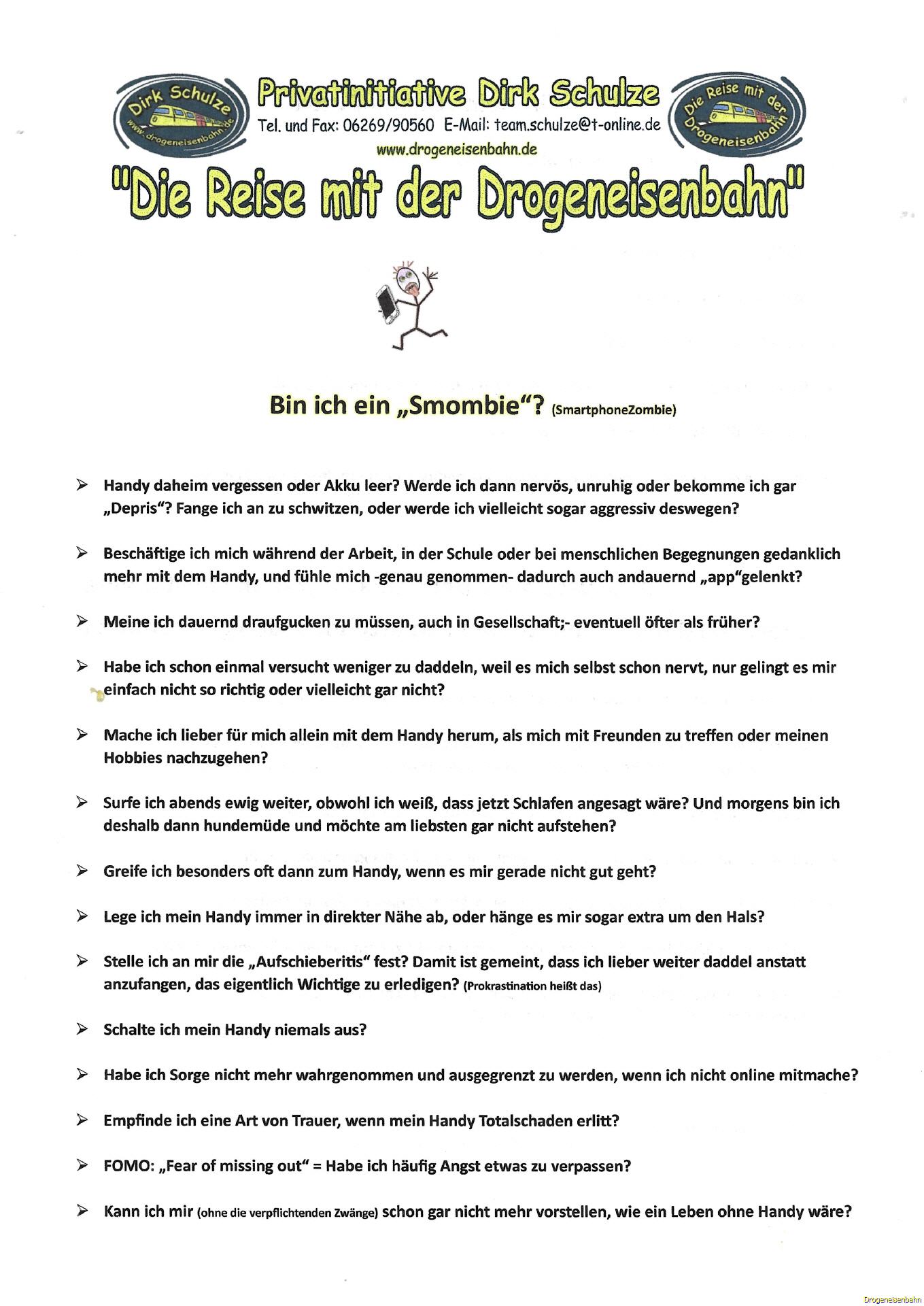 Die didaktisch interaktiv gestaltete Präsentation im Stil der Drogeneisenbahn ist abwechslungsreich konzipiert. Sie regt kontinuierlich zur Selbstreflexion an und fördert gemeinsame Überlegungen zu Verhaltensstrategien, wie der eigene Gebrauch gegebenenfalls reguliert werden kann (Digital Detox). Es gibt zwei Versionen, die sich an der Persönlichkeits- und Verstandesreife altersorientiert in der inhaltlichen Tiefenstufe unterscheiden!